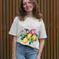 Of je het nu draagt met een short, jeans of een zwierige rok – dit shirt voegt een vleugje charme toe aan elke outfit. Ideaal voor een dagje stad, vakantie aan de kust of gewoon als vrolijke toevoeging aan je dagelijkse look.