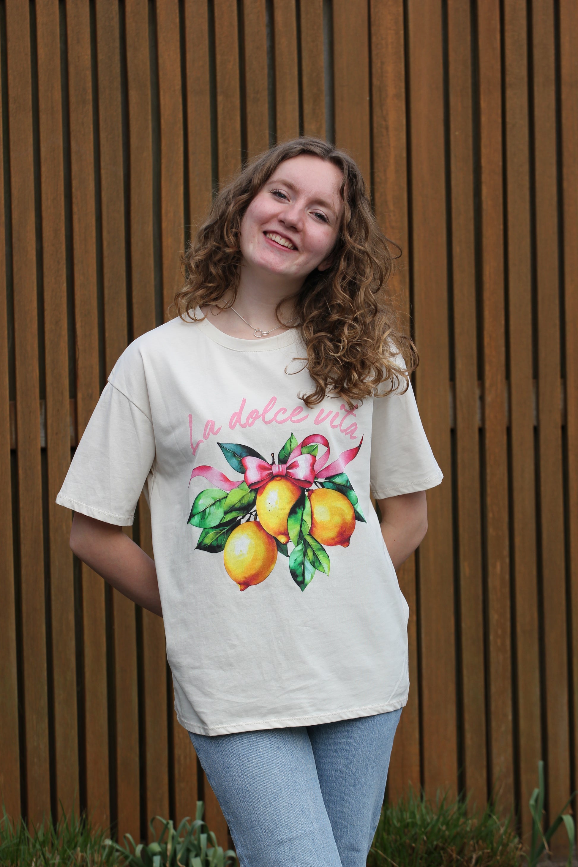 Laat je meevoeren naar de zonnige sferen van Zuid-Italië met het La Dolce Vita shirt Sofia. De speelse citroenprint en de roze strik geven dit shirt een frisse en vrouwelijke uitstraling, perfect voor zonnige dagen of een instant zomergevoel. Het beige katoen vormt een zachte, neutrale basis die makkelijk te combineren is, terwijl de details zorgen voor een vrolijke knipoog.